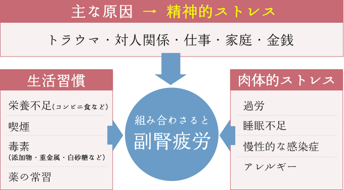 副腎疲労の一番の原因は精神的ストレスですが、過労、睡眠不足などの肉体的ストレスや生活習慣などが蓄積し、複合的な要素により引き起こされることがほとんどです。